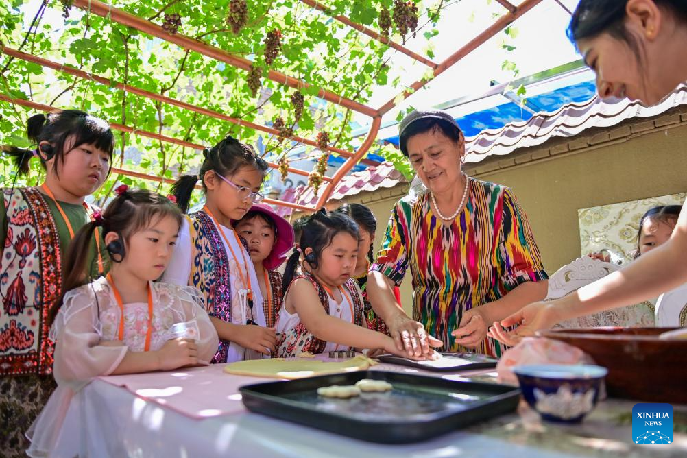 Children on a study tour learn to make local specialties at Kazanqi culture tourism area in Yining City, Ili Kazak Autonomous Prefecture, northwest China's Xinjiang Uygur Autonomous Region, July 23, 2025. In recent years, Yining City has revitalized its old town through cultural-tourism integration. The city has been preserving nine heritage sites and over 160 intangible cultural items while upgrading traditional crafts into creative industries. Ancient architecture and residential buildings have been transformed into tourist attractions, creating jobs and bringing vitality to the old town. (Xinhua/Ding Lei)