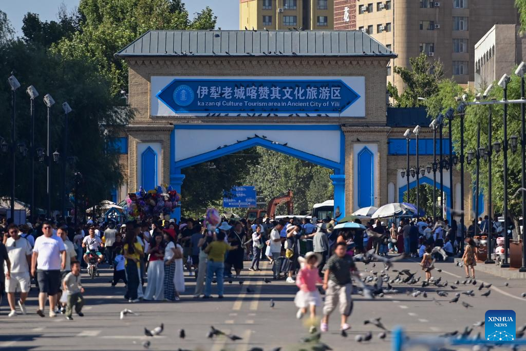 Tourists visit Kazanqi culture tourism area in Yining City, Ili Kazak Autonomous Prefecture, northwest China's Xinjiang Uygur Autonomous Region, July 23, 2025. In recent years, Yining City has revitalized its old town through cultural-tourism integration. The city has been preserving nine heritage sites and over 160 intangible cultural items while upgrading traditional crafts into creative industries. Ancient architecture and residential buildings have been transformed into tourist attractions, creating jobs and bringing vitality to the old town. (Xinhua/Ding Lei)