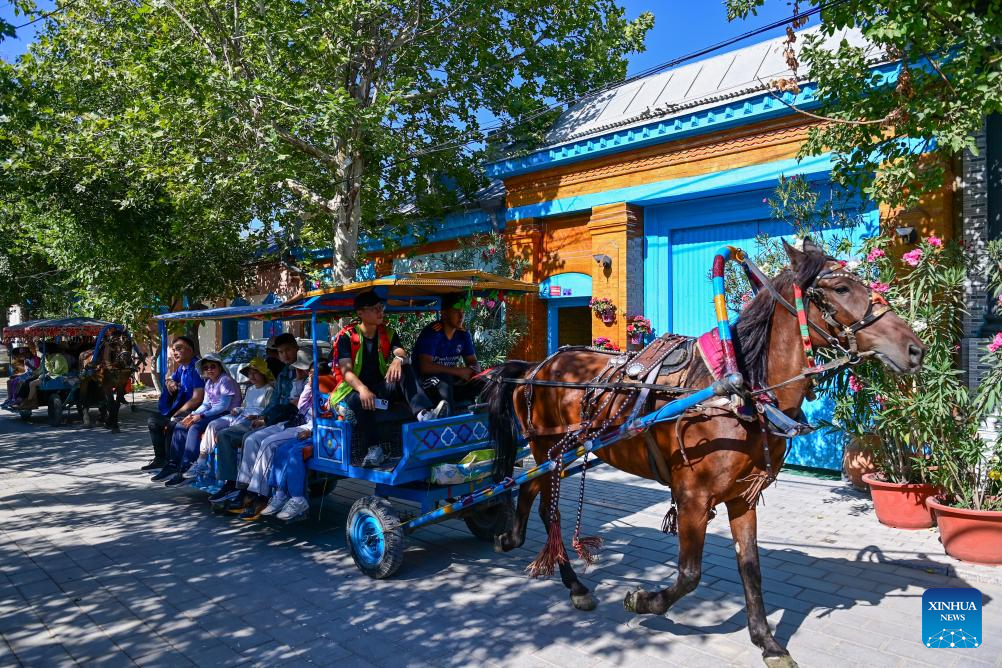 Tourists ride in a horse-drawn carriage to visit Kazanqi culture tourism area in Yining City, Ili Kazak Autonomous Prefecture, northwest China's Xinjiang Uygur Autonomous Region, July 23, 2025. In recent years, Yining City has revitalized its old town through cultural-tourism integration. The city has been preserving nine heritage sites and over 160 intangible cultural items while upgrading traditional crafts into creative industries. Ancient architecture and residential buildings have been transformed into tourist attractions, creating jobs and bringing vitality to the old town. (Xinhua/Ding Lei)