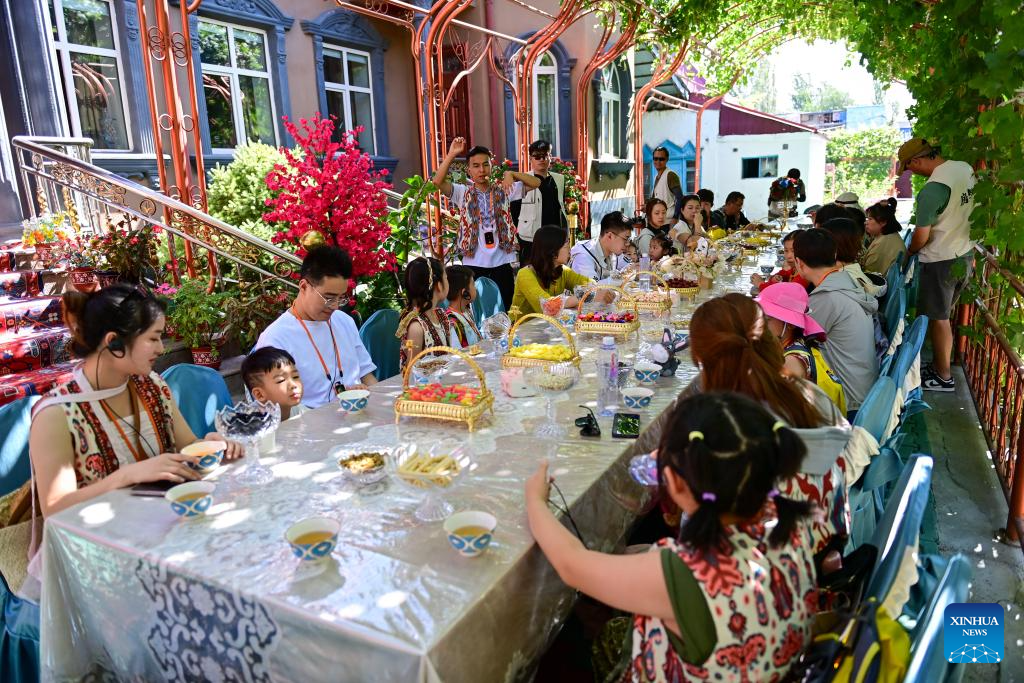 Tourists enjoy local specialties at Kazanqi culture tourism area in Yining City, Ili Kazak Autonomous Prefecture, northwest China's Xinjiang Uygur Autonomous Region, July 23, 2025. In recent years, Yining City has revitalized its old town through cultural-tourism integration. The city has been preserving nine heritage sites and over 160 intangible cultural items while upgrading traditional crafts into creative industries. Ancient architecture and residential buildings have been transformed into tourist attractions, creating jobs and bringing vitality to the old town. (Xinhua/Ding Lei)