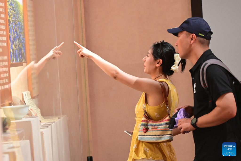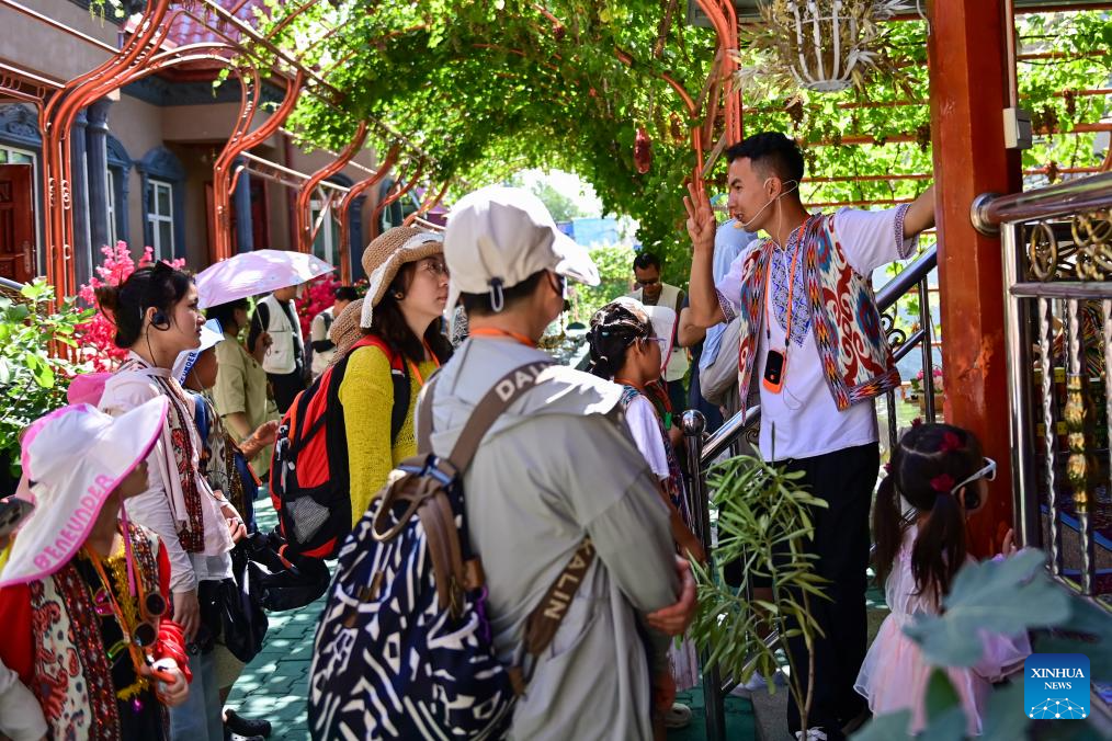 Tourists visit the pomegranate flower exhibition hall at Kazanqi culture tourism area in Yining City, Ili Kazak Autonomous Prefecture, northwest China's Xinjiang Uygur Autonomous Region, July 23, 2025. In recent years, Yining City has revitalized its old town through cultural-tourism integration. The city has been preserving nine heritage sites and over 160 intangible cultural items while upgrading traditional crafts into creative industries. Ancient architecture and residential buildings have been transformed into tourist attractions, creating jobs and bringing vitality to the old town. (Xinhua/Ding Lei)