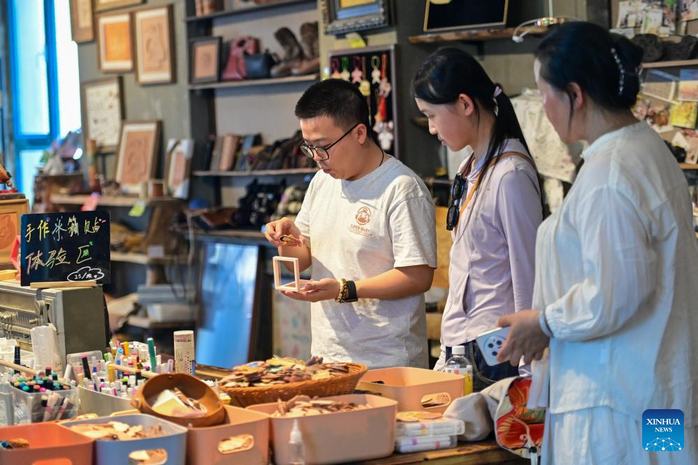 Tourists select goods at Kazanqi culture tourism area in Yining City, Ili Kazak Autonomous Prefecture, northwest China's Xinjiang Uygur Autonomous Region, July 23, 2025. In recent years, Yining City has revitalized its old town through cultural-tourism integration. The city has been preserving nine heritage sites and over 160 intangible cultural items while upgrading traditional crafts into creative industries. Ancient architecture and residential buildings have been transformed into tourist attractions, creating jobs and bringing vitality to the old town. (Xinhua/Ding Lei)