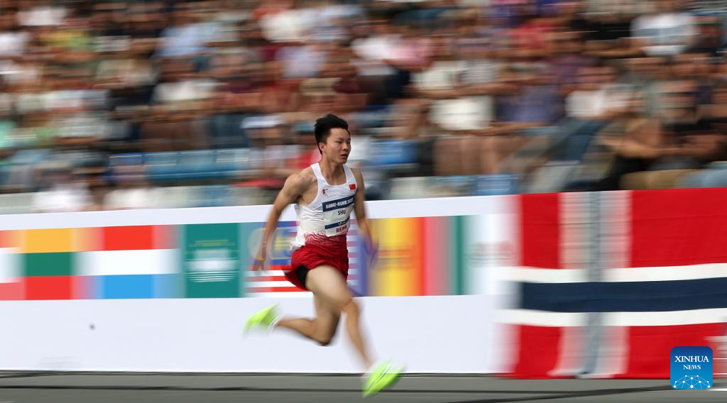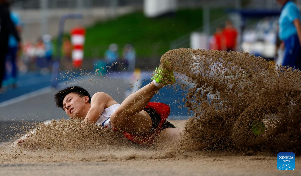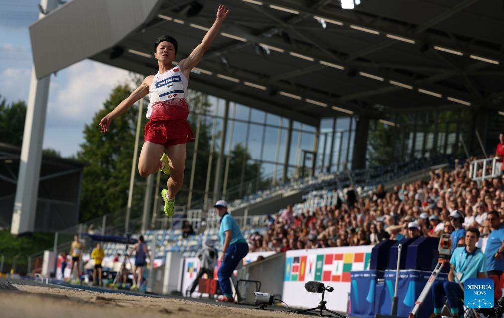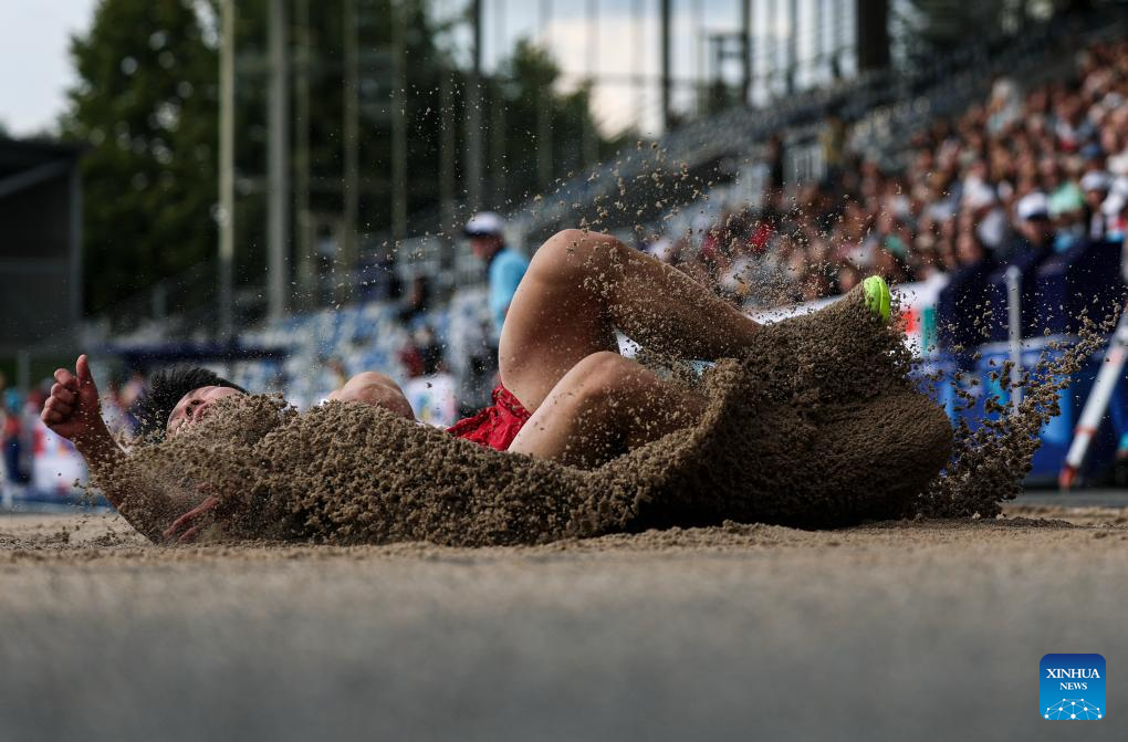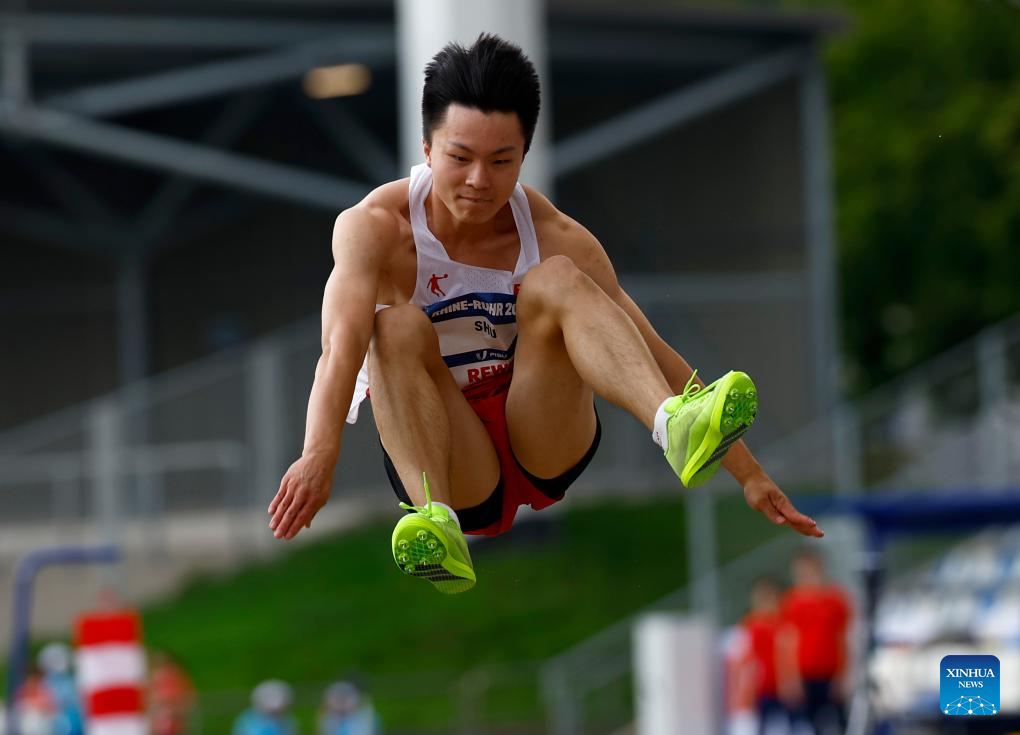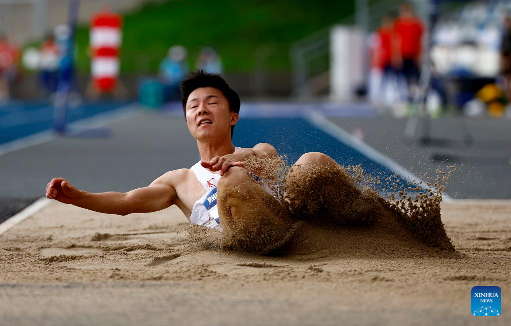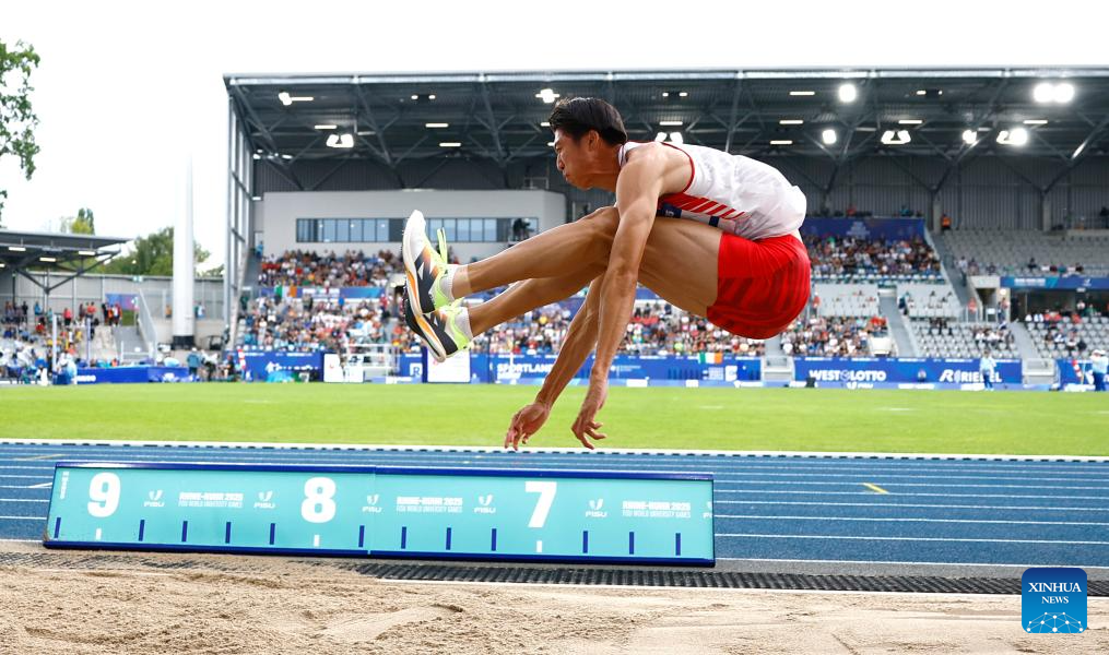 Shu Heng of China competes during the men's long jump final at the Rhine-Ruhr 2025 FISU World University Games in Bochum, Germany, July 24, 2025. (Xinhua/Hu Xingyu)