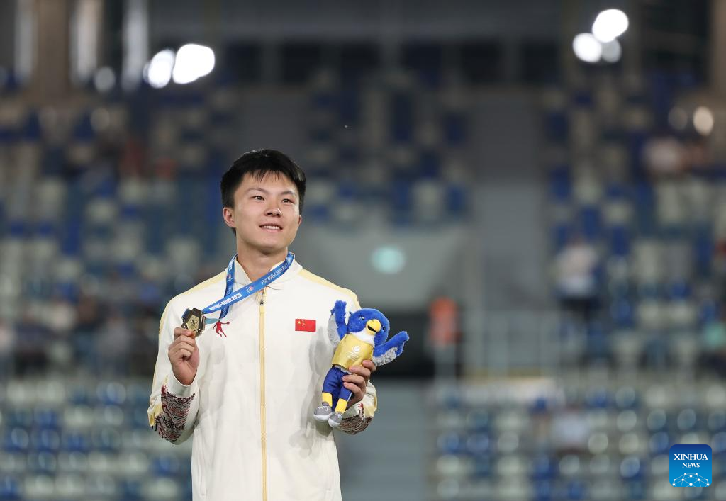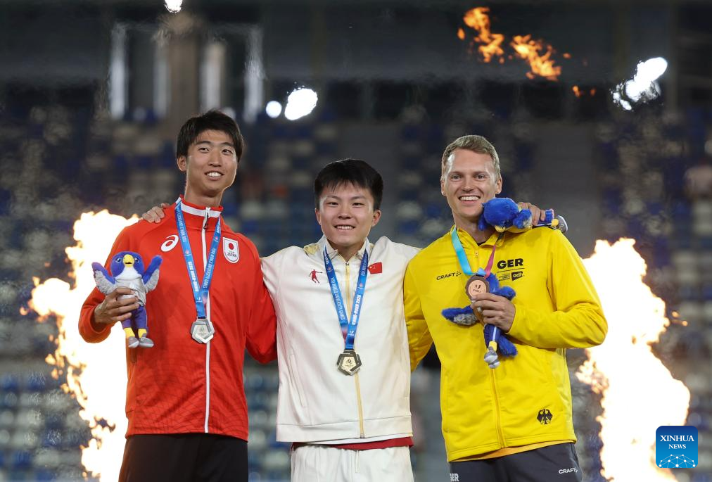 Gold medalist Shu Heng of China poses for photos during the awarding ceremony after the men's long jump final at the Rhine-Ruhr 2025 FISU World University Games in Bochum, Germany, July 24, 2025. (Xinhua/Hu Xingyu)