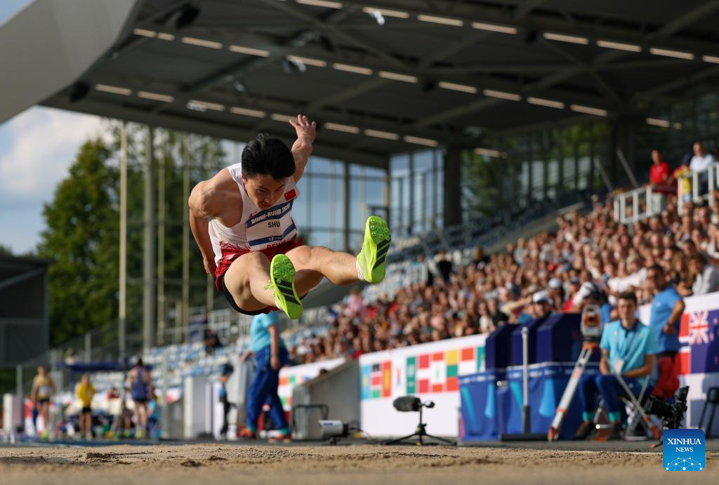Shu Heng of China competes during the men's long jump final at the Rhine-Ruhr 2025 FISU World University Games in Bochum, Germany, July 24, 2025. (Xinhua/Li Ying)