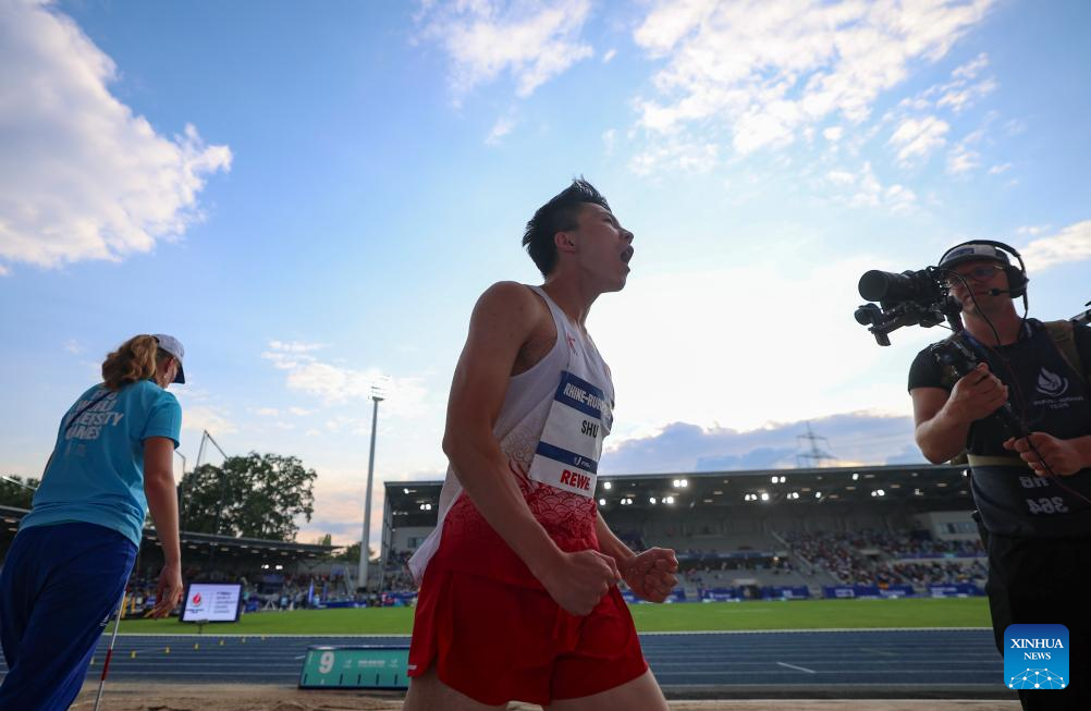 Shu Heng of China celebrates after the men's long jump final at the Rhine-Ruhr 2025 FISU World University Games in Bochum, Germany, July 24, 2025. (Xinhua/Li Ying)