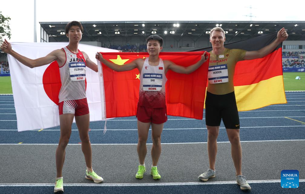 Shu Heng (C) of China celebrates after the men's long jump final at the Rhine-Ruhr 2025 FISU World University Games in Bochum, Germany, July 24, 2025. (Xinhua/Hu Xingyu)