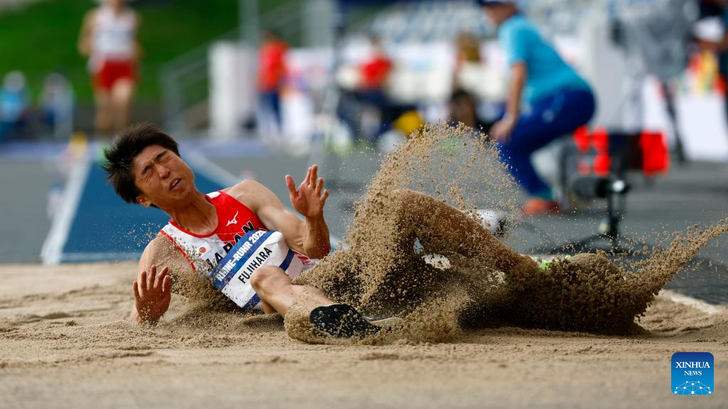 Fujihara Koki of Japan competes during the men's long jump final at the Rhine-Ruhr 2025 FISU World University Games in Bochum, Germany, July 24, 2025. (Xinhua/Li Ying)
