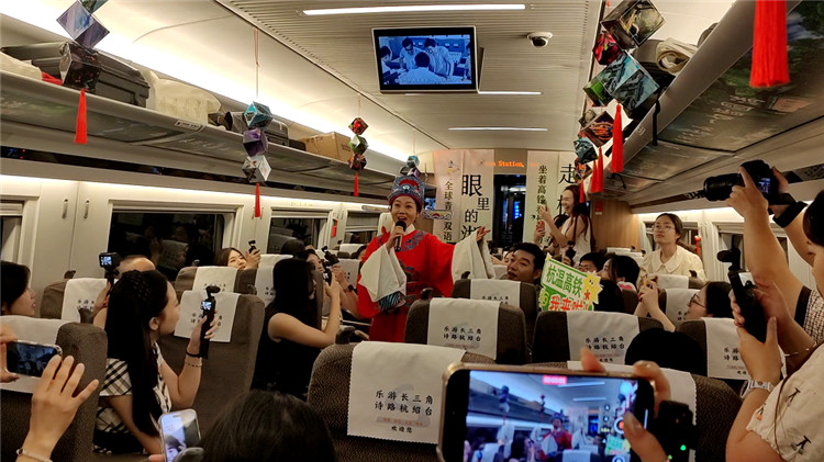 Young anchors enjoy a Huangmei Opera performance on the Hangzhou-Wenzhou high-speed railway. (Photo courtesy of Communication University of China)