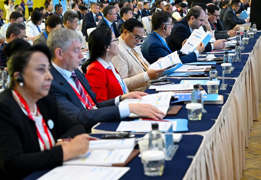 This photo taken on July 25, 2025 shows a scene at the plenary session of the Shanghai Cooperation Organization (SCO) Media and Think Tank Summit in Zhengzhou, capital of central China's Henan Province. (Xinhua/Hao Yuan)
