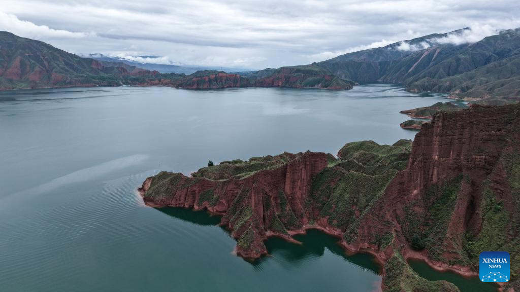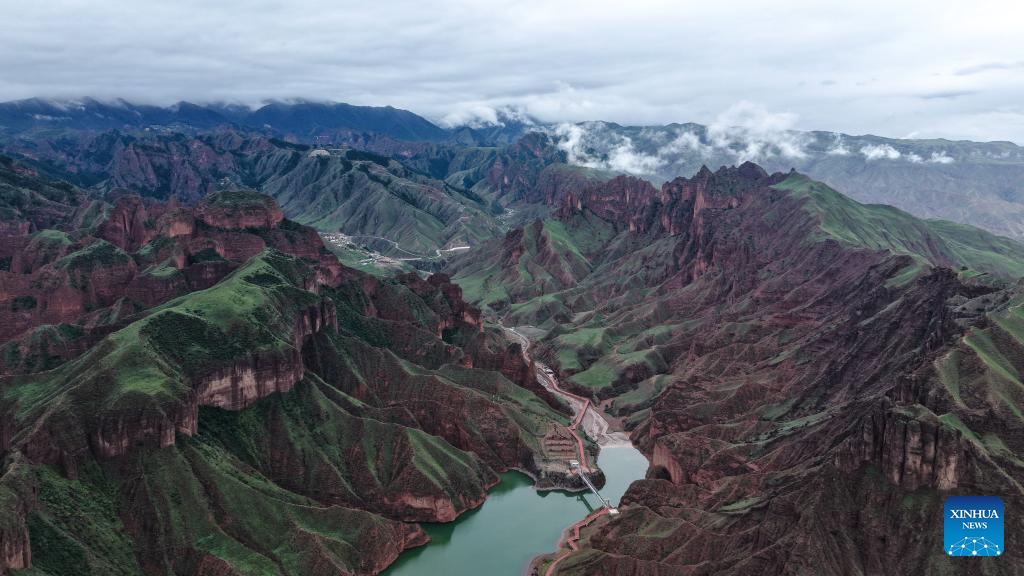 An aerial drone photo taken on July 24, 2025 shows a view of the Kanbula National Geopark in Huangnan Tibetan Autonomous Prefecture, northwest China's Qinghai Province. Nestled on the northeastern edge of the Qinghai-Tibet Plateau, the Kanbula National Geopark spans roughly 3,149 square kilometers with striking fiery-red Danxia landforms, towering jagged peaks, hidden caves and emerald lakes. Beyond its visual splendor, the park's true value lies beneath the surface, serving as a premier location for geoscientific research and public science education. (Xinhua/Qi Zhiyue)