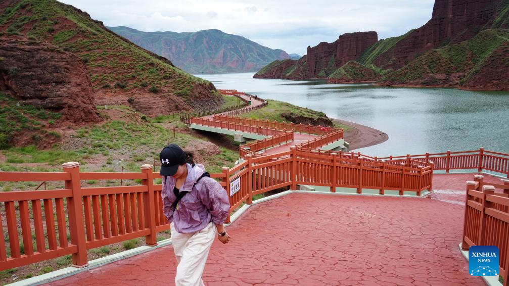 A tourist visits the Kanbula National Geopark in Huangnan Tibetan Autonomous Prefecture, northwest China's Qinghai Province, July 24, 2025. Nestled on the northeastern edge of the Qinghai-Tibet Plateau, the Kanbula National Geopark spans roughly 3,149 square kilometers with striking fiery-red Danxia landforms, towering jagged peaks, hidden caves and emerald lakes. Beyond its visual splendor, the park's true value lies beneath the surface, serving as a premier location for geoscientific research and public science education. (Xinhua/Qi Zhiyue)