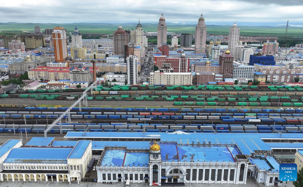 An aerial drone photo taken on July 25, 2025 shows freight trains preparing to depart from the railway station in Manzhouli, north China's Inner Mongolia Autonomous Region. The Manzhouli railway port, China's largest land port, has handled 30,000 China-Europe freight train trips and nearly 3 million TEUs (twenty-foot equivalent units) of goods since 2013. (Photo by Huang Xu/Xinhua)