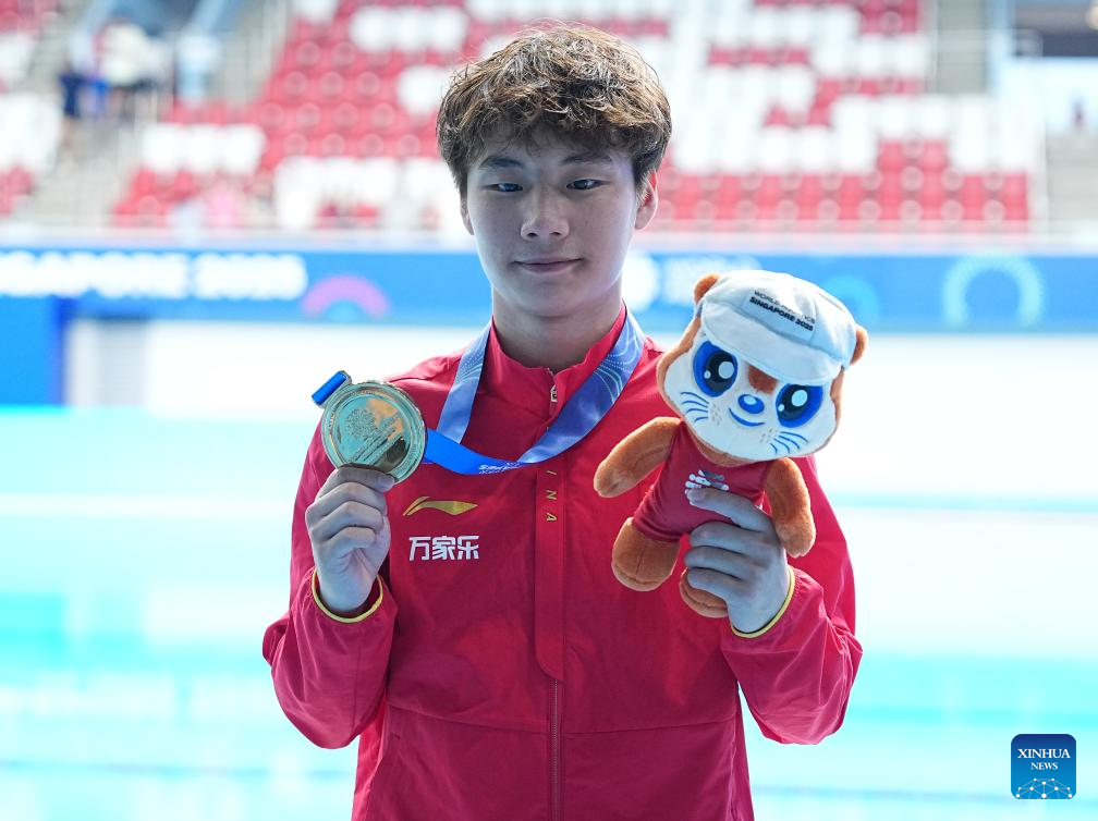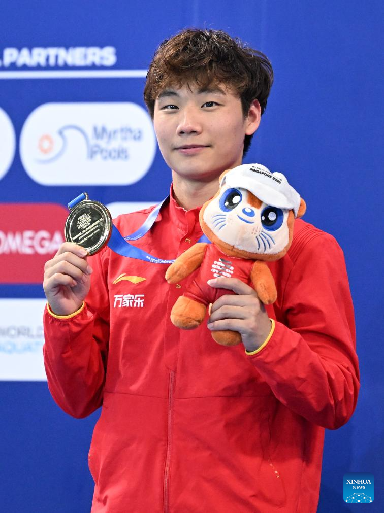 Bronze medalist Yan Siyu of China poses for photos after the awarding ceremony for the men's 1m springboard of diving at the World Aquatics Championships in Singapore, July 27, 2025. (Xinhua/Xue Yuge)