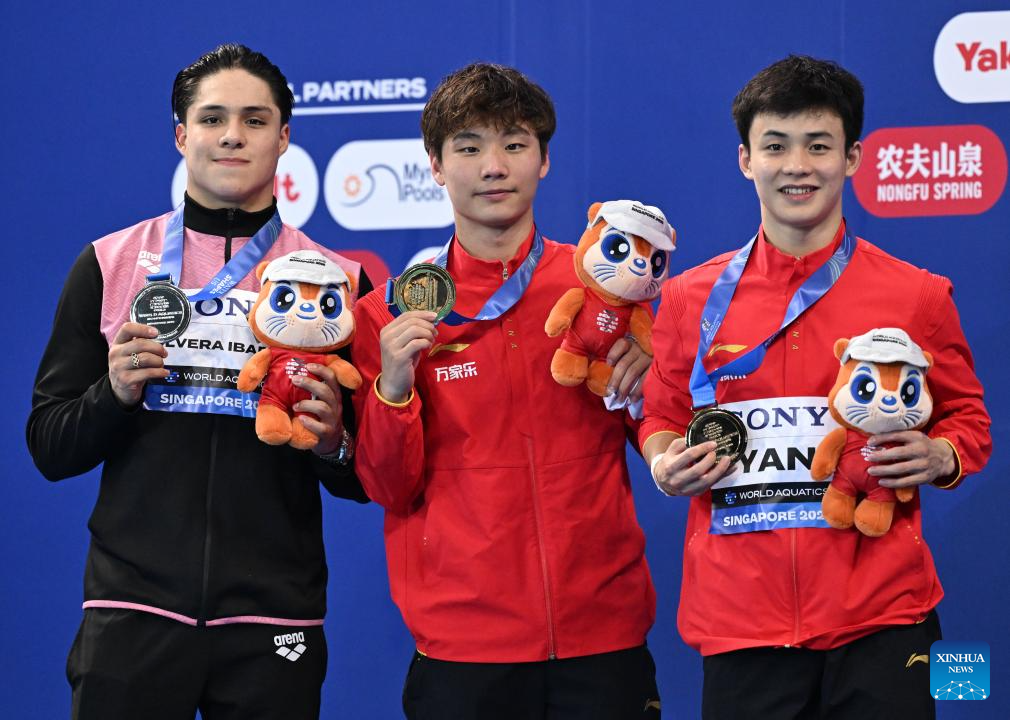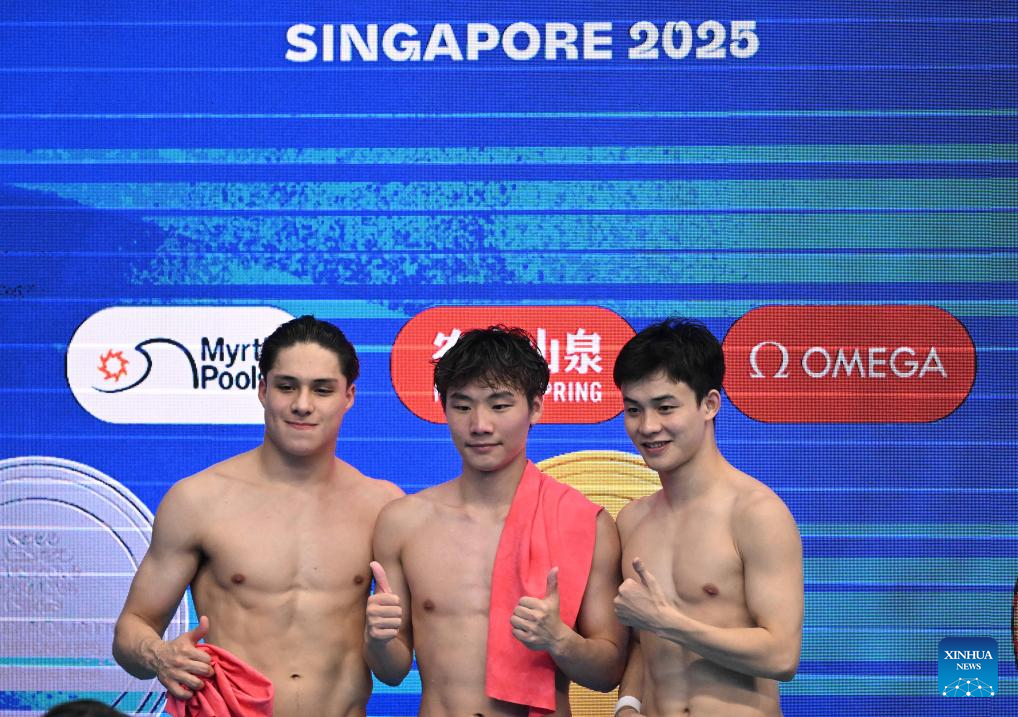 Gold medalist Zheng Jiuyuan (C) of China, silver medalist Osmar Olvera Ibarra (L) of Mexico and bronze medalist Yan Siyu of China pose for photo after the men's 1m springboard final of diving at the World Aquatics Championships in Singapore, July 27, 2025. (Xinhua/Xue Yuge)