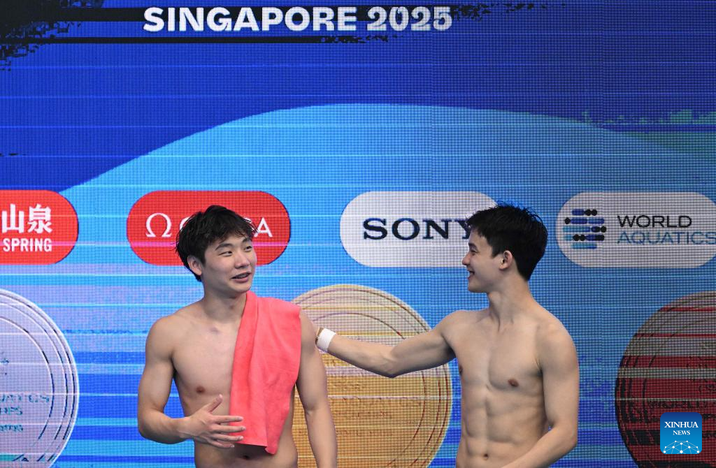 Gold medalist Zheng Jiuyuan (L) of China and bronze medalist Yan Siyu of China react after the men's 1m springboard final of diving at the World Aquatics Championships in Singapore, July 27, 2025. (Xinhua/Xue Yuge)