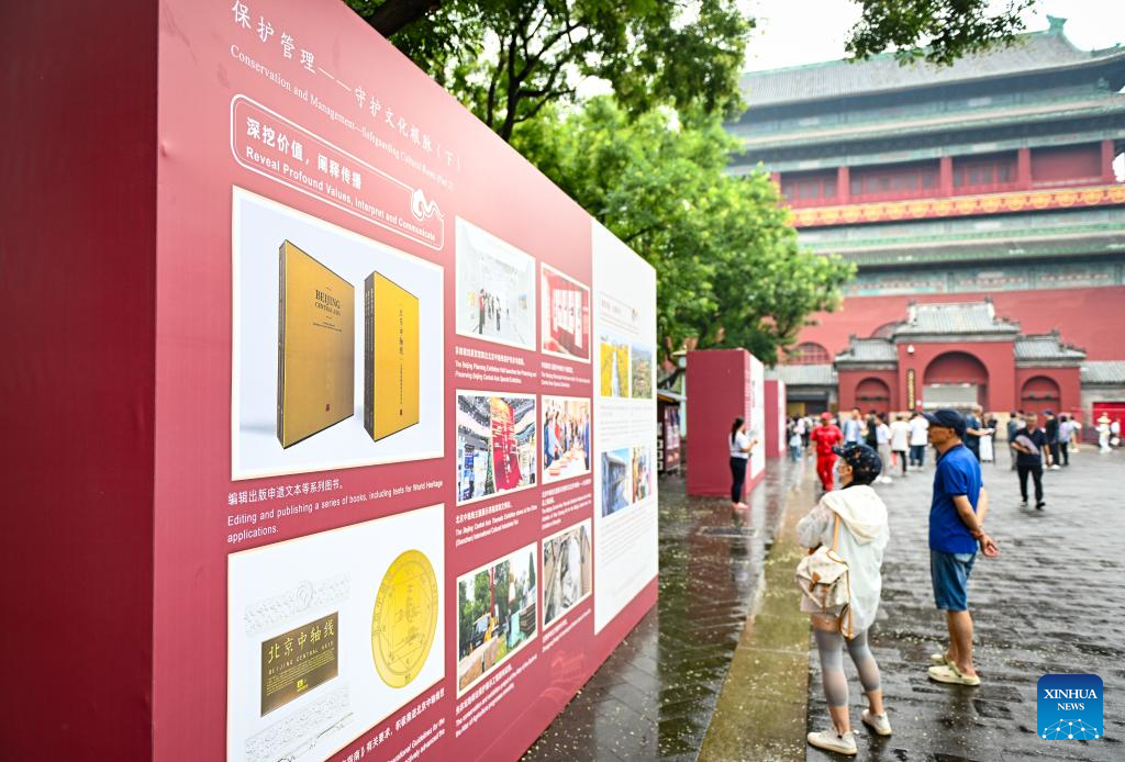 People view a display board on the conservation and management of Beijing Central Axis in Beijing, capital of China, July 27, 2025.