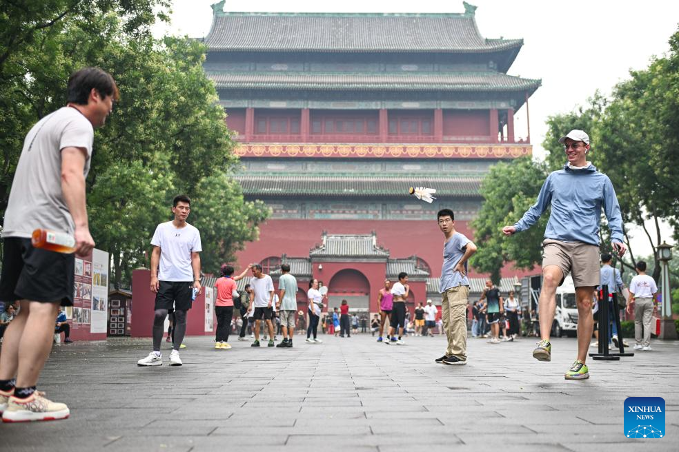 People kick a shuttlecock at a square connecting the Bell and Drum Towers in Beijing, capital of China, July 27, 2025.