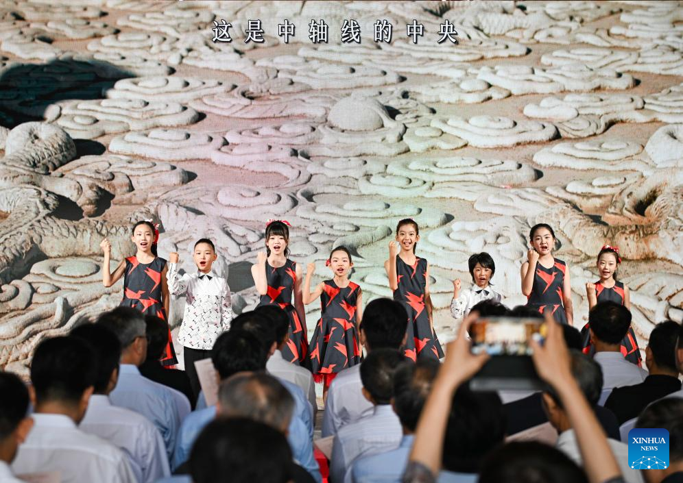 Children perform at an event marking the first anniversary of the successful inscription of Beijing Central Axis on the UNESCO World Heritage List at the Drum Tower in Beijing, capital of China, July 27, 2025.