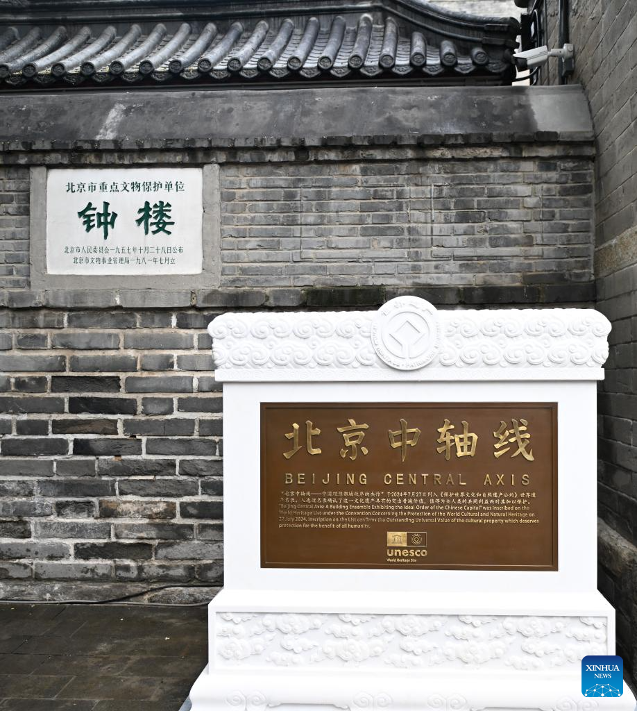 This photo shows the UNESCO World Heritage sign at the Bell Tower, an ancient landmark on the Beijing Central Axis, in Beijing, capital of China, July 27, 2025.