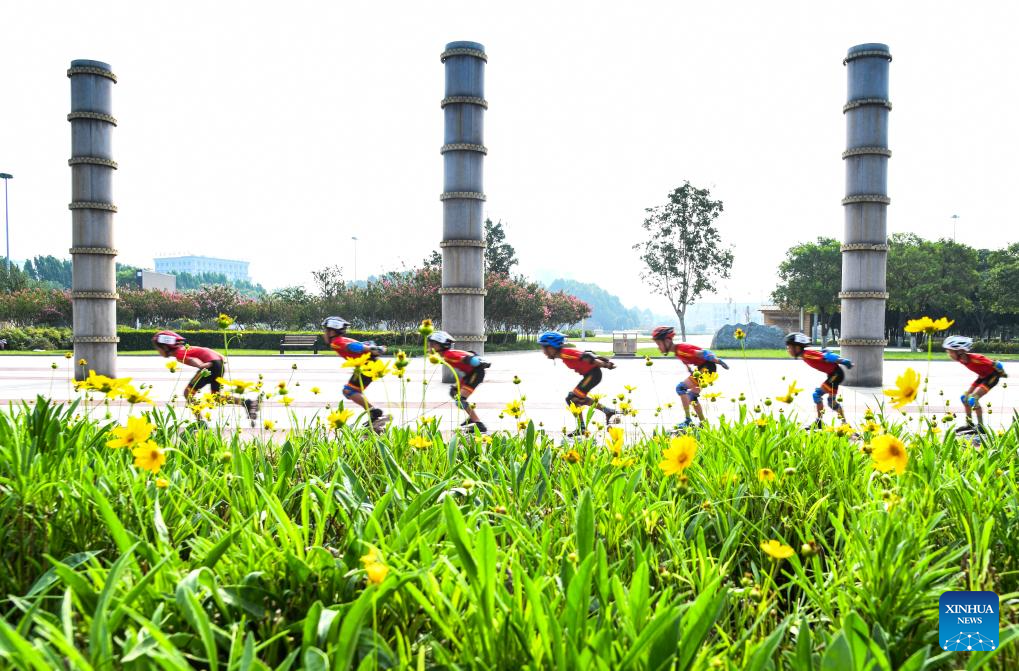 Children practice roller skating at a square in Jiyuan City, central China's Henan Province, July 26, 2025. Children participate in various activities during summer vacation across the country. (Photo by Miao Qiunao/Xinhua)