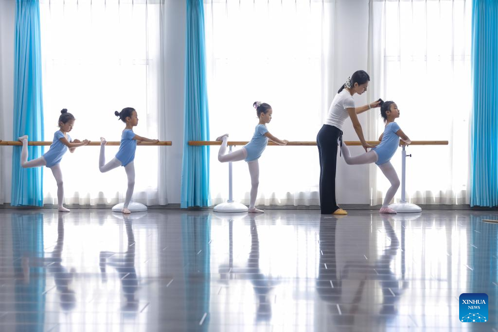 Children attending a dancing course practice in Qingdao City, east China's Shandong Province, July 26, 2025. Children participate in various activities during summer vacation across the country. (Photo by Zhang Ying/Xinhua)