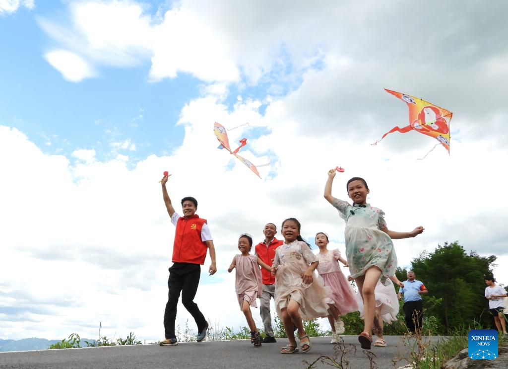 Children fly kites at Tiefo Village of Dazhou City, southwest China's Sichuan Province, July 25, 2025. Children participate in various activities during summer vacation across the country. (Photo by Deng Liangkui/Xinhua)