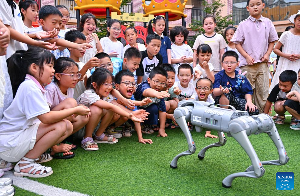 Children interact with a robotic dog in Meishan City, southwest China's Sichuan Province, July 25, 2025. Children participate in various activities during summer vacation across the country. (Photo by Pan Jianyong/Xinhua)