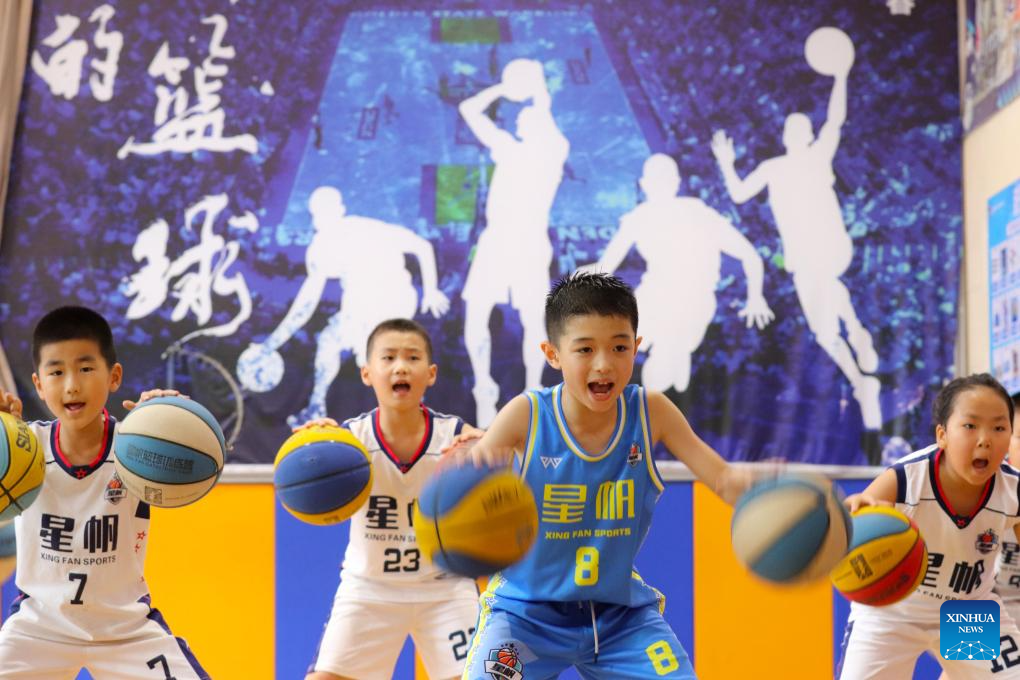 Children practice basketball skills in Yongzhou City, central China's Hunan, July 26, 2025. Children participate in various activities during summer vacation across the country. (Photo by He Hongfu/Xinhua)