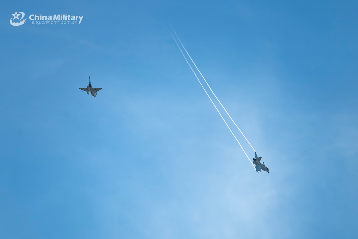 Two J-10 fighter jets attached to an aviation brigade with the air force under the Chinese PLA Southern Theater Command maneuver in the sky during a day-and-night flight training exercise. (eng.chinamil.com.cn/Photo by Xiao Rui)