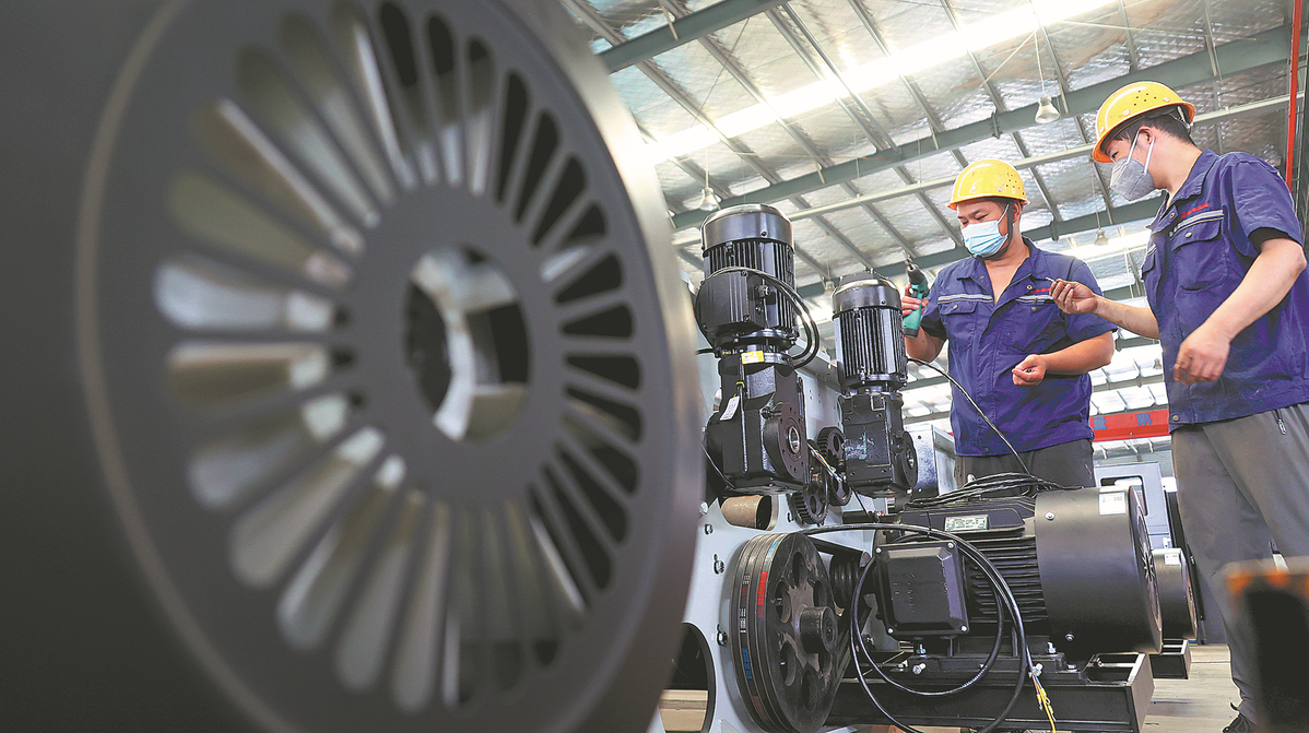 Employees work on the assembly line of a textile machinery manufacturer in Lianyungang, Jiangsu province. GENG YUHE/FOR CHINA DAILY