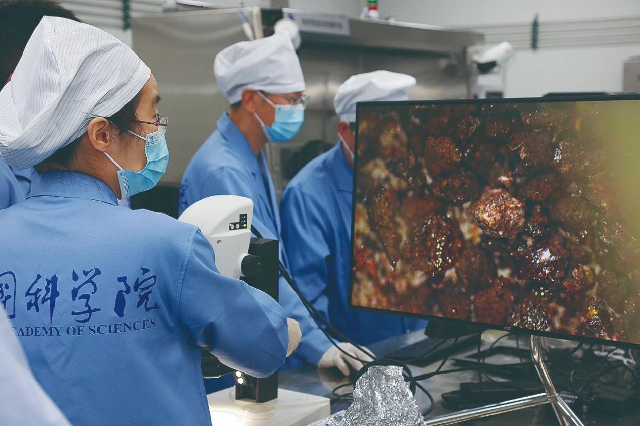 Researchers from the National Astronomical Observatories, Chinese Academy of Sciences, examine microscope images of lunar rock fragments. (Photo provided by the National Astronomical Observatories, Chinese Academy of Sciences)