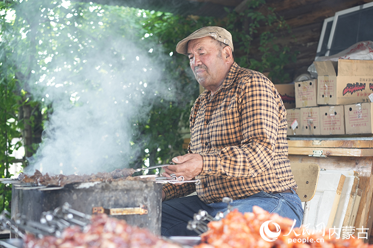 A man roasts meat at a courtyard in Enhe, a Russian ethnic township in Ergun, Hulun Buir, north China's Inner Mongolia Autonomous Region. (People's Daily Online/Li Rui)