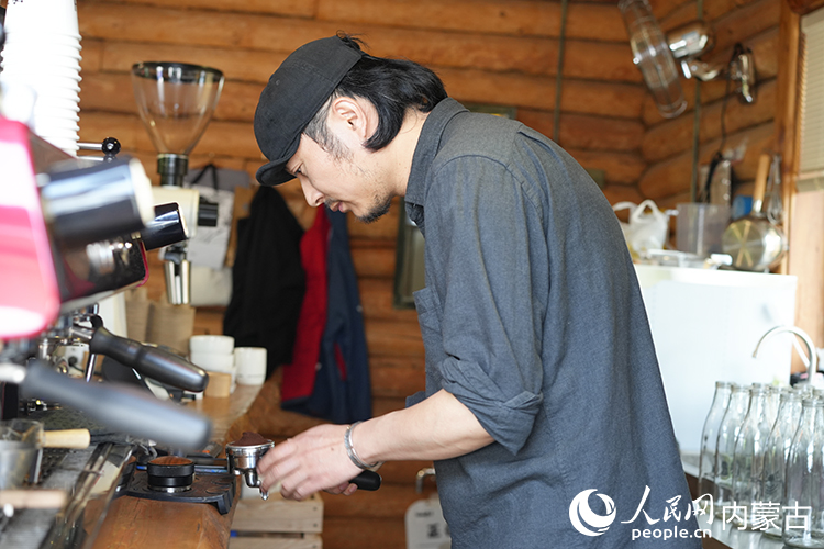 Yu Xiao makes coffee at a café in Enhe, a Russian ethnic township in Ergun, Hulun Buir, north China's Inner Mongolia Autonomous Region. (People's Daily Online/Li Rui)