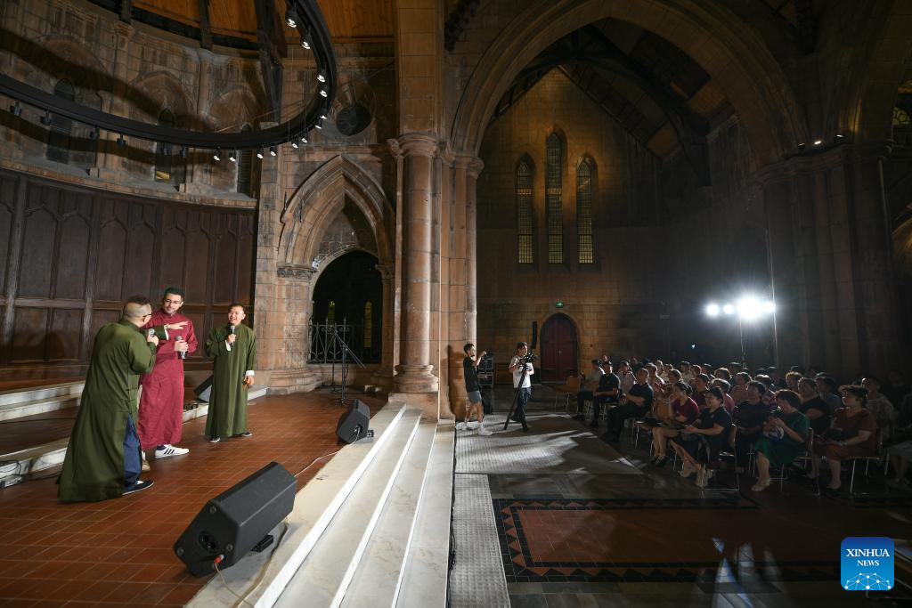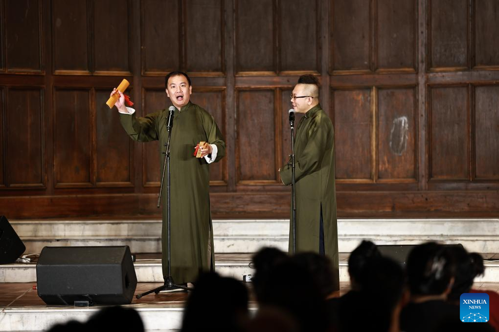 Performers perform Xiangsheng, or crosstalk comedy, at the Anglican Art Centre in Tianjin Municipality, north China, July 28, 2025.
