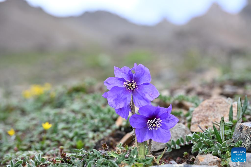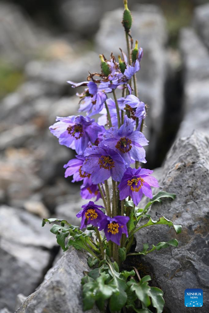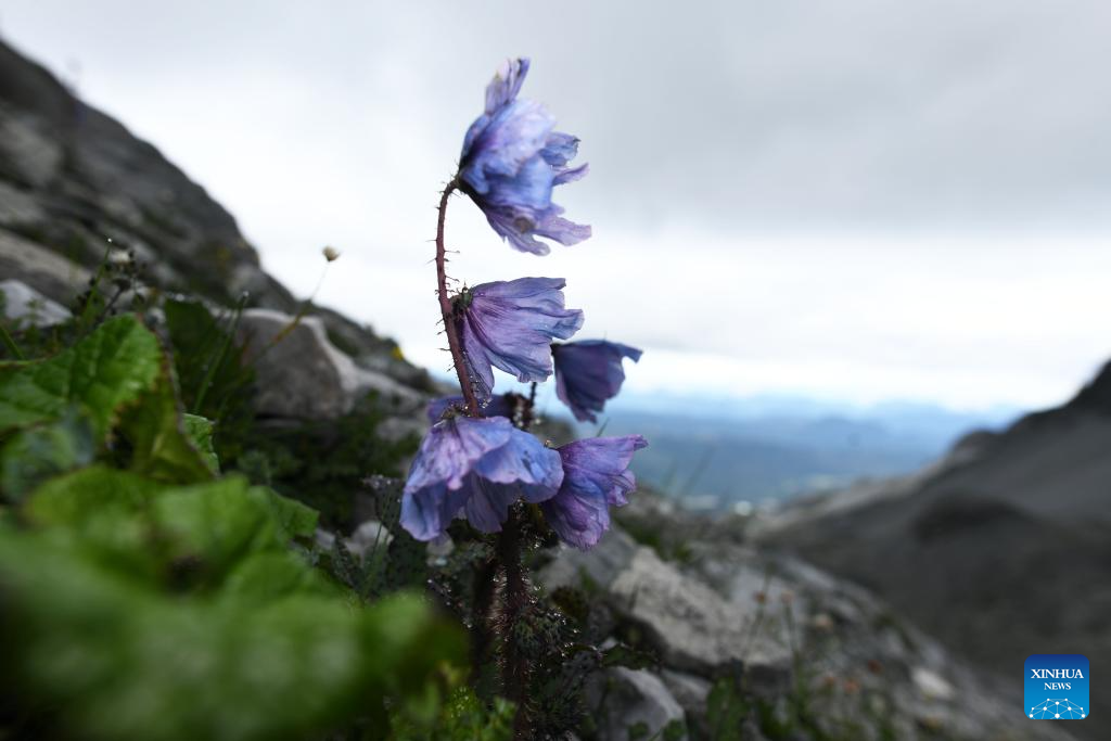 This photo taken on July 23, 2025 shows a Meconopsis pseudovenusta G. Taylor on Shika Snow Mountain scenic area in Shangri-la, the Deqen Tibetan Autonomous Prefecture, southwest China's Yunnan Province. Known as "Plant Kingdom" in China, Yunnan nurtures a wealth of rare alpine plants thanks to its unique geographical position, diverse landforms and complex climatic conditions. (Xinhua/Qin Qing)