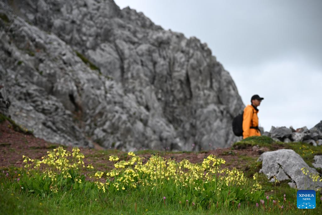 This photo taken on July 23, 2025 shows a patch of Primula sikkimensis Hook. on Shika Snow Mountain scenic area in Shangri-la, the Deqen Tibetan Autonomous Prefecture, southwest China's Yunnan Province. Known as "Plant Kingdom" in China, Yunnan nurtures a wealth of rare alpine plants thanks to its unique geographical position, diverse landforms and complex climatic conditions. (Xinhua/Qin Qing)