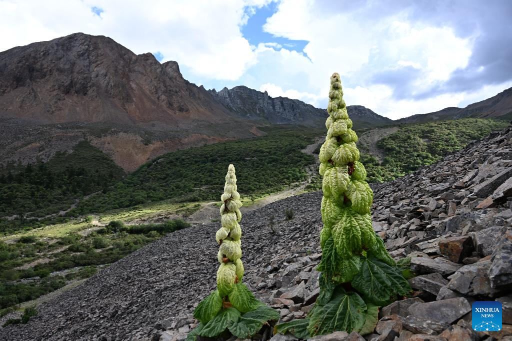 This photo taken on July 22, 2025 shows a Rheum nobile Hook.f.et Thomson in Shangri-la, the Deqen Tibetan Autonomous Prefecture, southwest China's Yunnan Province. Known as "Plant Kingdom" in China, Yunnan nurtures a wealth of rare alpine plants thanks to its unique geographical position, diverse landforms and complex climatic conditions. (Xinhua/Qin Qing)