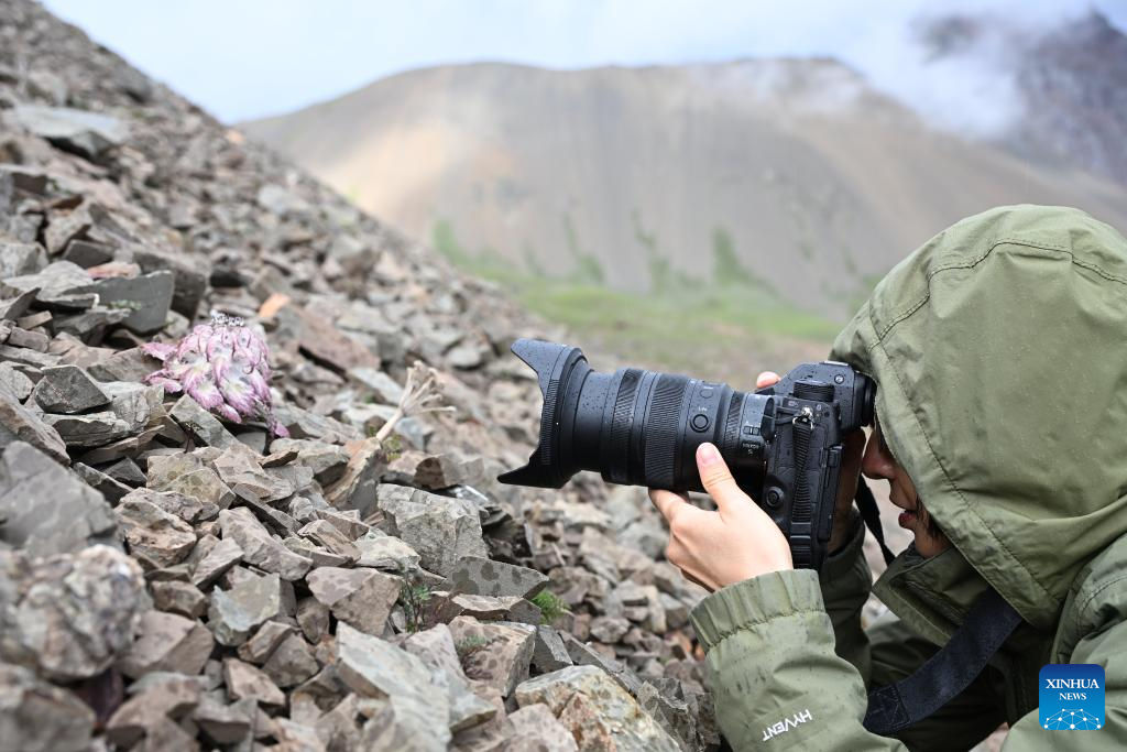 A photographer takes photos of a Saussurea medusa Maxim. in Deqin County, the Deqen Tibetan Autonomous Prefecture, southwest China's Yunnan Province, July 25, 2025. Known as "Plant Kingdom" in China, Yunnan nurtures a wealth of rare alpine plants thanks to its unique geographical position, diverse landforms and complex climatic conditions. (Xinhua/Qin Qing)