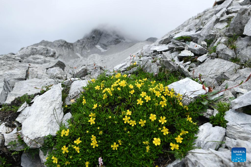 This photo taken on July 23, 2025 shows a Potentilla articulata Franch. on Yulong Snow Mountain in Lijiang, southwest China's Yunnan Province. Known as "Plant Kingdom" in China, Yunnan nurtures a wealth of rare alpine plants thanks to its unique geographical position, diverse landforms and complex climatic conditions. (Photo by Zhao Qingzu/Xinhua)