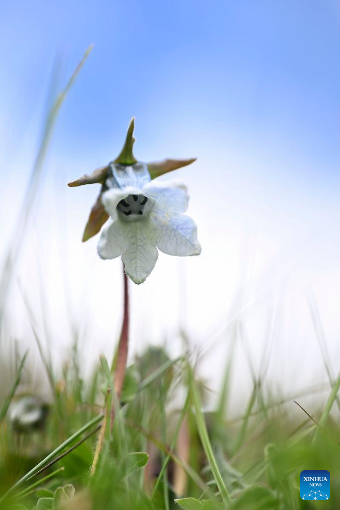 This photo taken on July 23, 2025 shows a Codonopsis bulleyana Forrest ex Diels on Shika Snow Mountain scenic area in Shangri-la, the Deqen Tibetan Autonomous Prefecture, southwest China's Yunnan Province. Known as "Plant Kingdom" in China, Yunnan nurtures a wealth of rare alpine plants thanks to its unique geographical position, diverse landforms and complex climatic conditions. (Xinhua/Qin Qing)