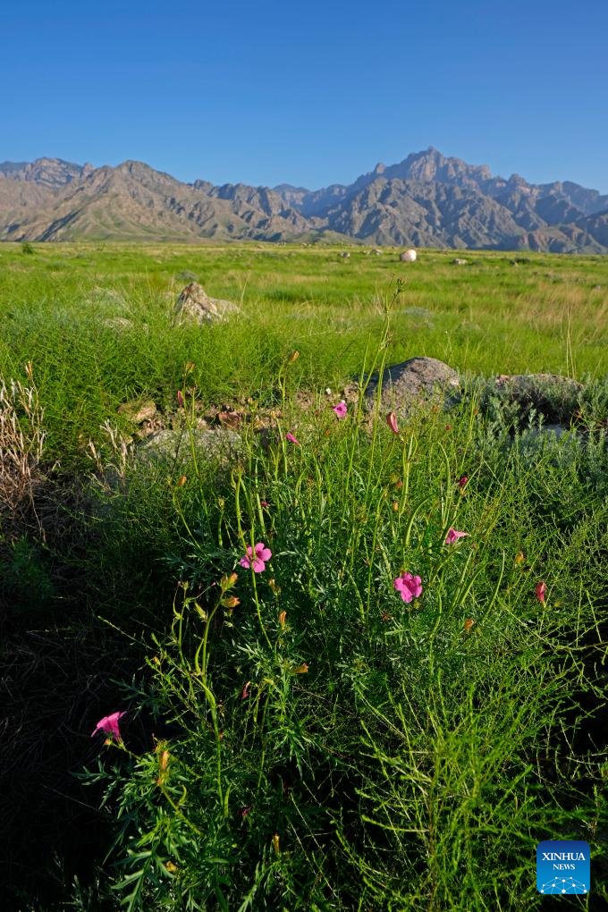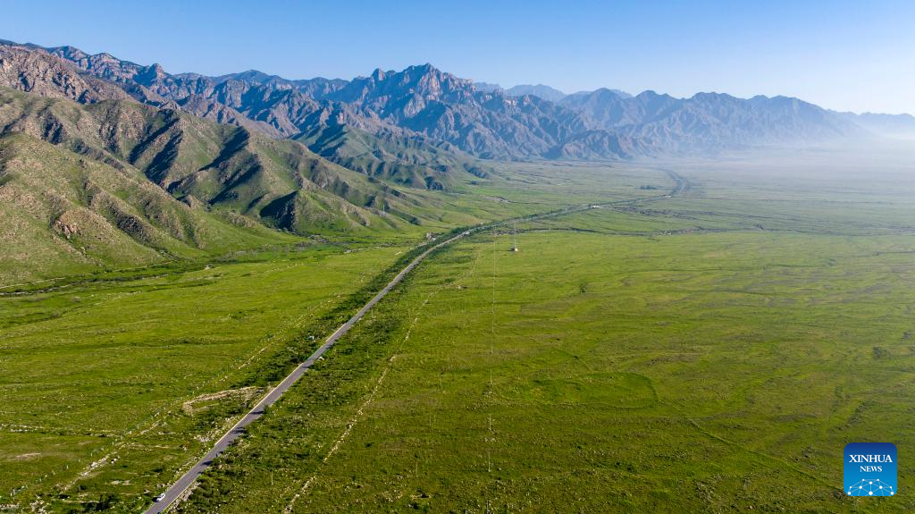 An aerial drone photo taken on July 29, 2025 shows lush grass and trees at the foot of the Helan Mountain in northwest China's Ningxia Hui Autonomous Region. (Xinhua/Wang Peng)