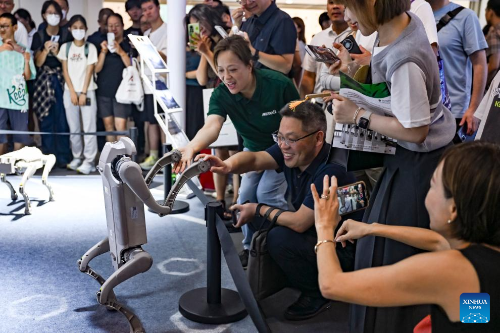 Visitors interact with a robot dog at the 2025 World AI Conference (WAIC) in east China's Shanghai, July 29, 2025. The multitude of intelligent robots on display have attracted lots of attention at the 2025 WAIC in Shanghai. Besides the ones that are versed in calligraphy and martial combat, there are also a range of robots adept at performing practical tasks in diverse work and life scenarios. (Xinhua/Chen Haoming)