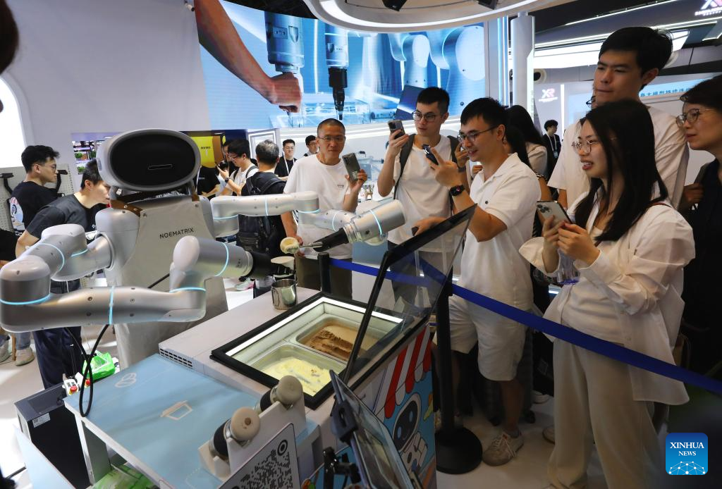 A service robot demonstrates to visitors how to make an ice cream ball at the 2025 World AI Conference (WAIC) in east China's Shanghai, July 29, 2025. The multitude of intelligent robots on display have attracted lots of attention at the 2025 WAIC in Shanghai. Besides the ones that are versed in calligraphy and martial combat, there are also a range of robots adept at performing practical tasks in diverse work and life scenarios. (Xinhua/Fang Zhe)