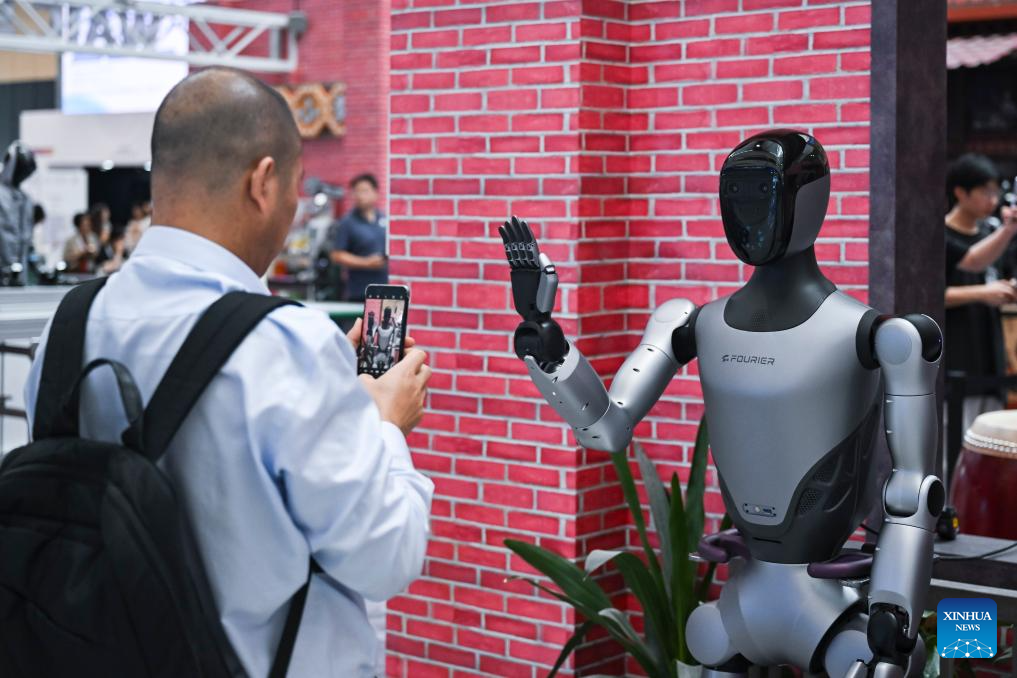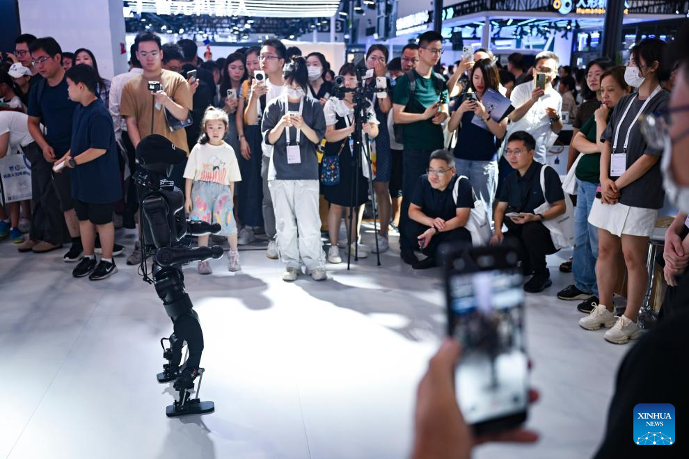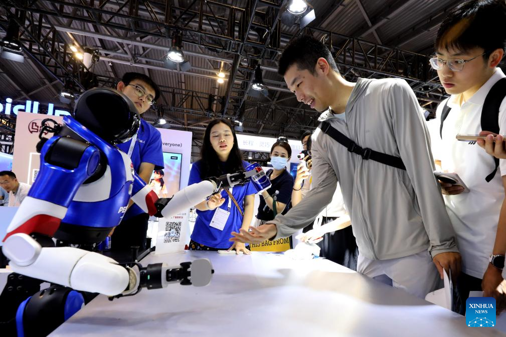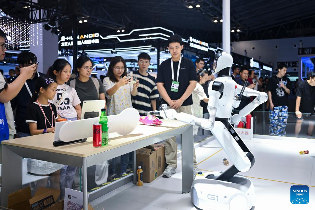 Visitors view a robot that can be used in various scenarios such as retail and industry at the 2025 World AI Conference (WAIC) in east China's Shanghai, July 29, 2025. The multitude of intelligent robots on display have attracted lots of attention at the 2025 WAIC in Shanghai. Besides the ones that are versed in calligraphy and martial combat, there are also a range of robots adept at performing practical tasks in diverse work and life scenarios. (Xinhua/Chen Haoming)