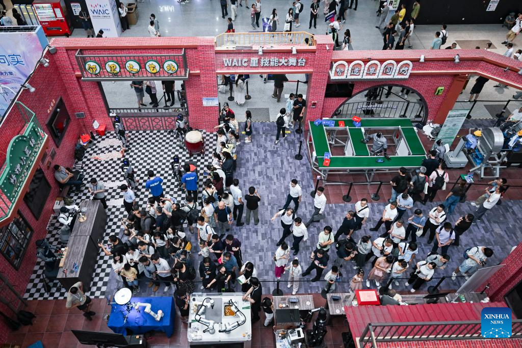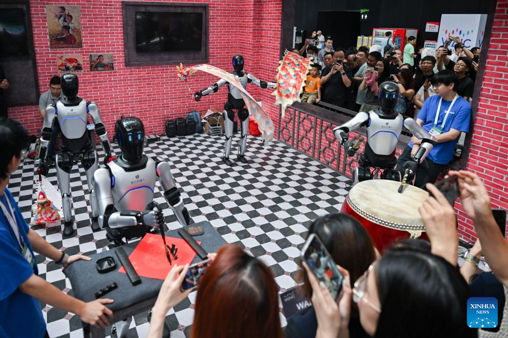 Multiple robots showcase their skills at the 2025 World AI Conference (WAIC) in east China's Shanghai, July 29, 2025. The multitude of intelligent robots on display have attracted lots of attention at the 2025 WAIC in Shanghai. Besides the ones that are versed in calligraphy and martial combat, there are also a range of robots adept at performing practical tasks in diverse work and life scenarios. (Xinhua/Chen Haoming)