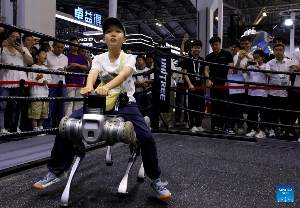 A child experiences riding a quadruped robot at the 2025 World AI Conference (WAIC) in east China's Shanghai, July 29, 2025. The multitude of intelligent robots on display have attracted lots of attention at the 2025 WAIC in Shanghai. Besides the ones that are versed in calligraphy and martial combat, there are also a range of robots adept at performing practical tasks in diverse work and life scenarios. (Xinhua/Fang Zhe)