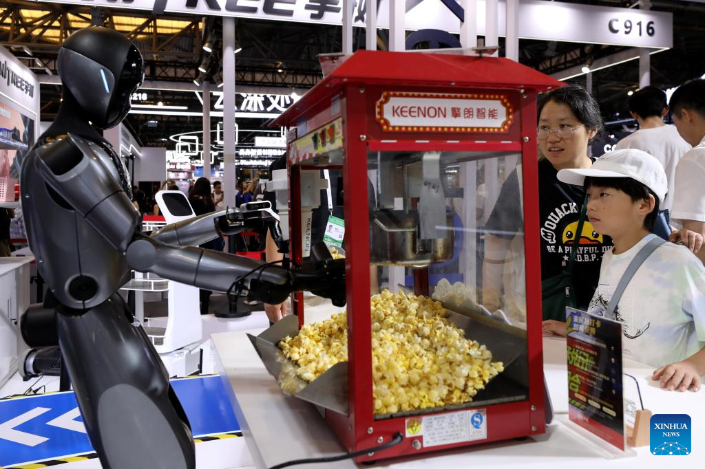 Visitors watch a robot working at a popcorn stand at the 2025 World AI Conference (WAIC) in east China's Shanghai, July 29, 2025. The multitude of intelligent robots on display have attracted lots of attention at the 2025 WAIC in Shanghai. Besides the ones that are versed in calligraphy and martial combat, there are also a range of robots adept at performing practical tasks in diverse work and life scenarios. (Xinhua/Fang Zhe)