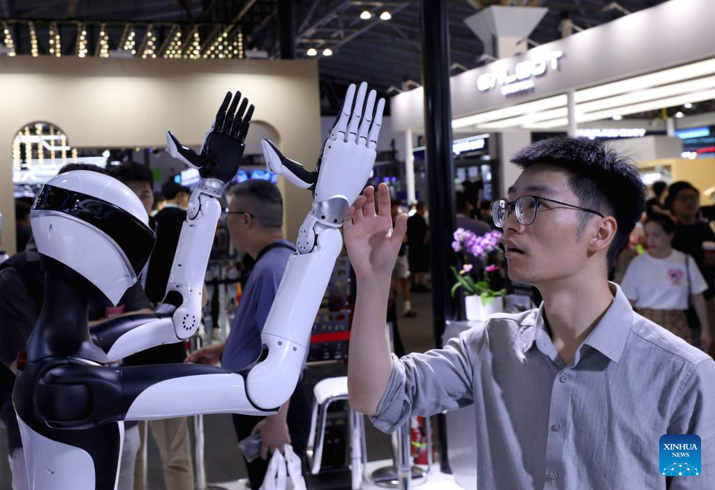 A visitor interacts with a robot at the 2025 World AI Conference (WAIC) in east China's Shanghai, July 29, 2025. The multitude of intelligent robots on display have attracted lots of attention at the 2025 WAIC in Shanghai. Besides the ones that are versed in calligraphy and martial combat, there are also a range of robots adept at performing practical tasks in diverse work and life scenarios. (Xinhua/Chen Haoming)