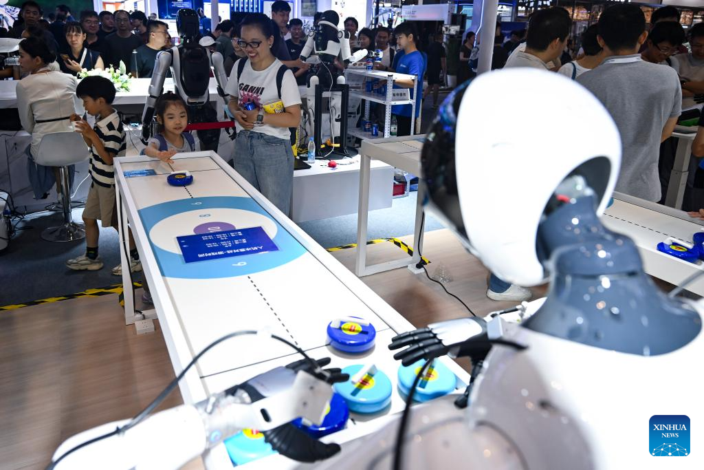 A child plays curling with a robot at the 2025 World AI Conference (WAIC) in east China's Shanghai, July 29, 2025. The multitude of intelligent robots on display have attracted lots of attention at the 2025 WAIC in Shanghai. Besides the ones that are versed in calligraphy and martial combat, there are also a range of robots adept at performing practical tasks in diverse work and life scenarios. (Xinhua/Chen Haoming)
